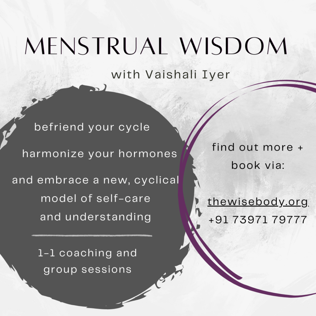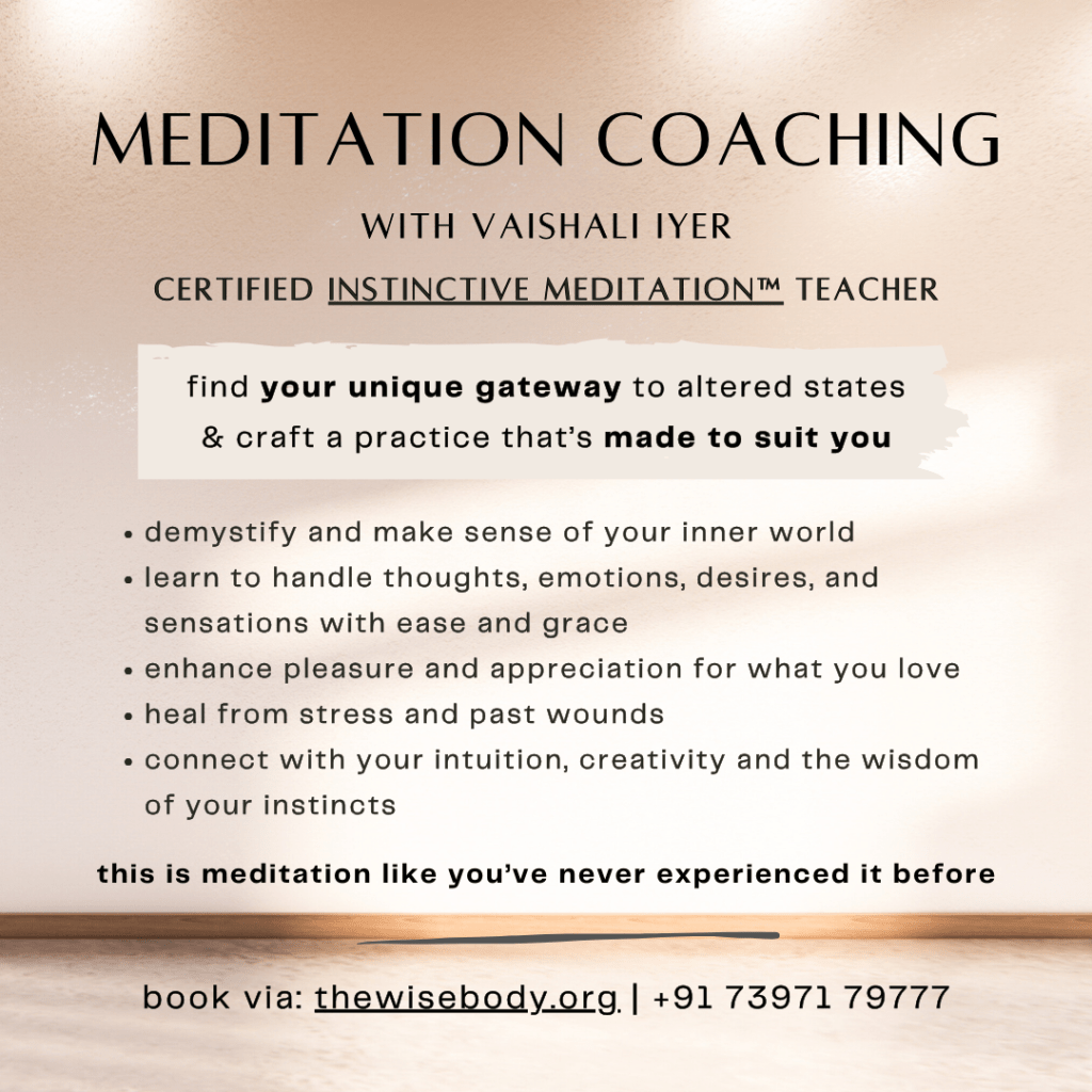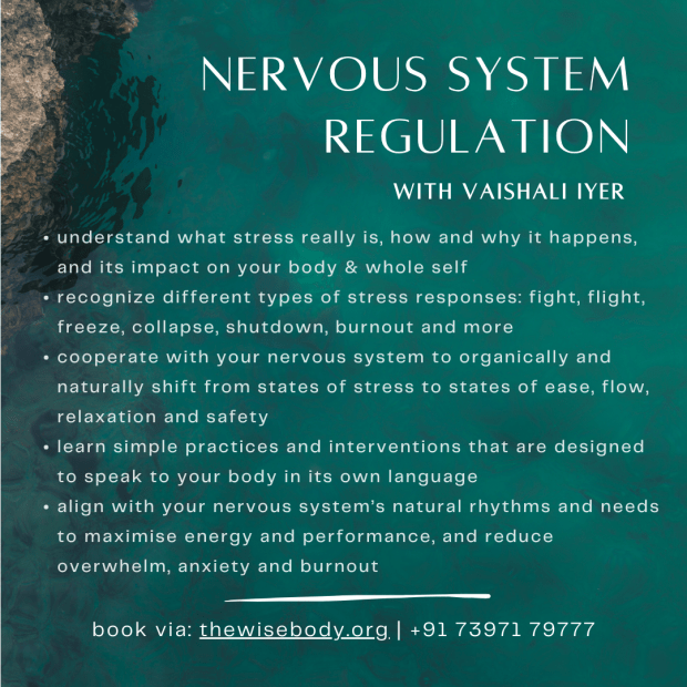My name is Vaishali and I’m a somatic coach and practitioner based in Bangalore, India. I teach people how to live in harmony with their bodies and honour their deeper self using a variety of practices: breath and bodywork, nervous system regulation, menstrual cycle awareness and somatic meditation.