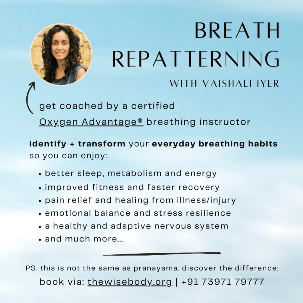 I’m trained in the Oxygen Advantage® Functional Breathing method, and have years of experience with breathwork through yoga and pranayama training.